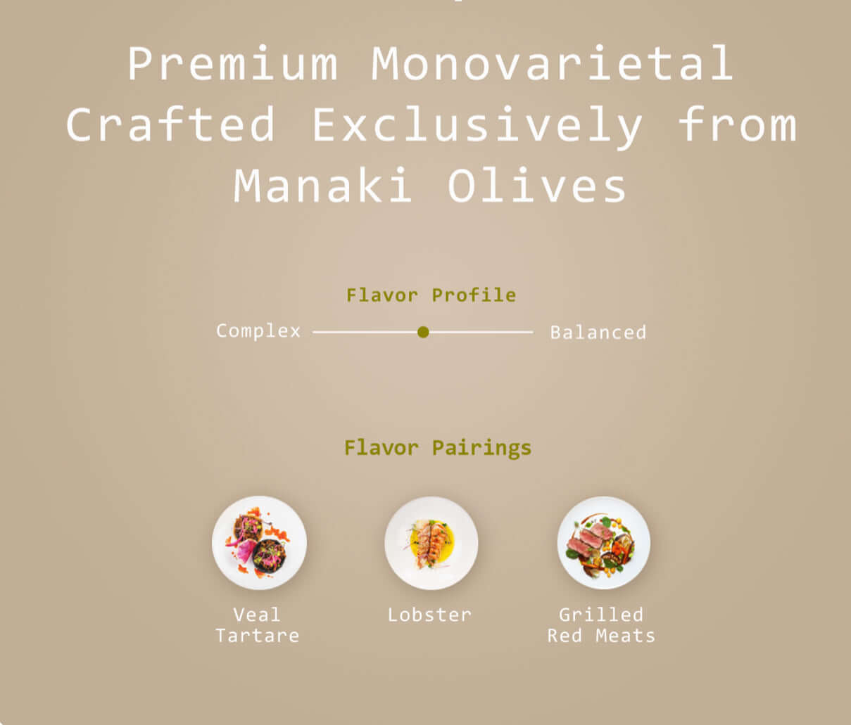 The epitome of the art of blending, Koroneiki and Manaki bring forth hints of freshly cut grass blended with aromas of tomato leaves and spiced up peppery sensations.